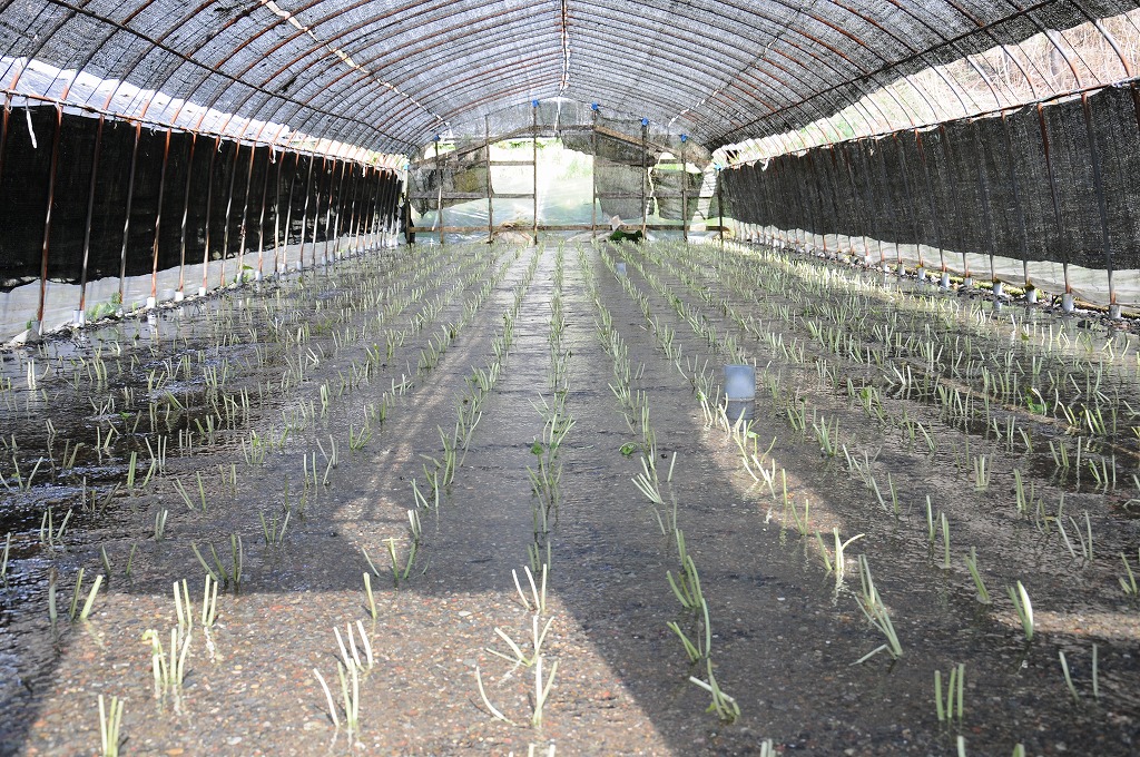 私たちは清流が湧き出る水で、丁寧にわさびを栽培しております。